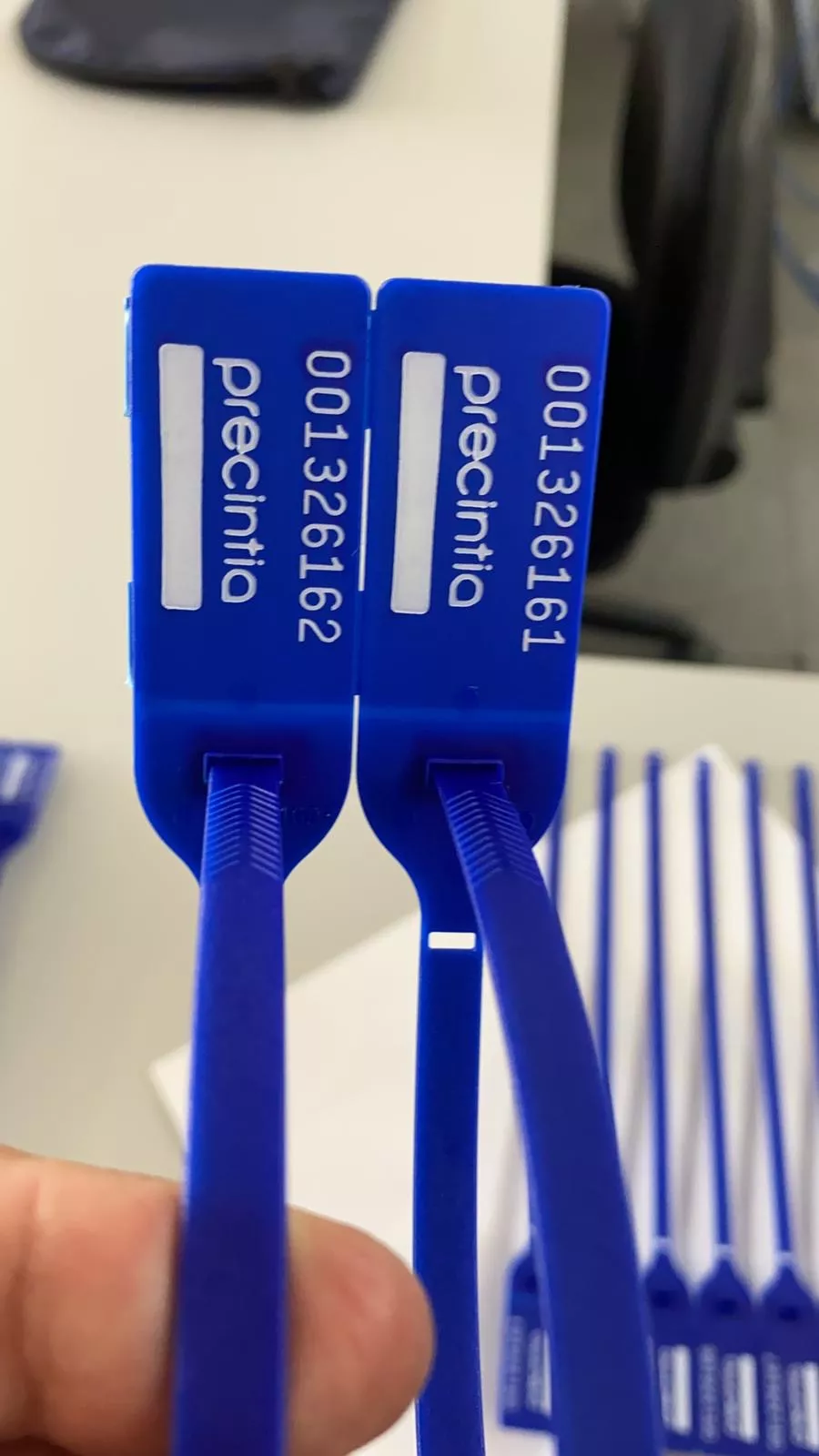 Dispositivo de cierre técnico de un solo uso para asegurar cajas, contenedores o palets. Cada pieza cuenta con una numeración única correlativa que certifica que su mercancía llega a su destino en Barcelona sin haber sido abierta durante el trayecto.